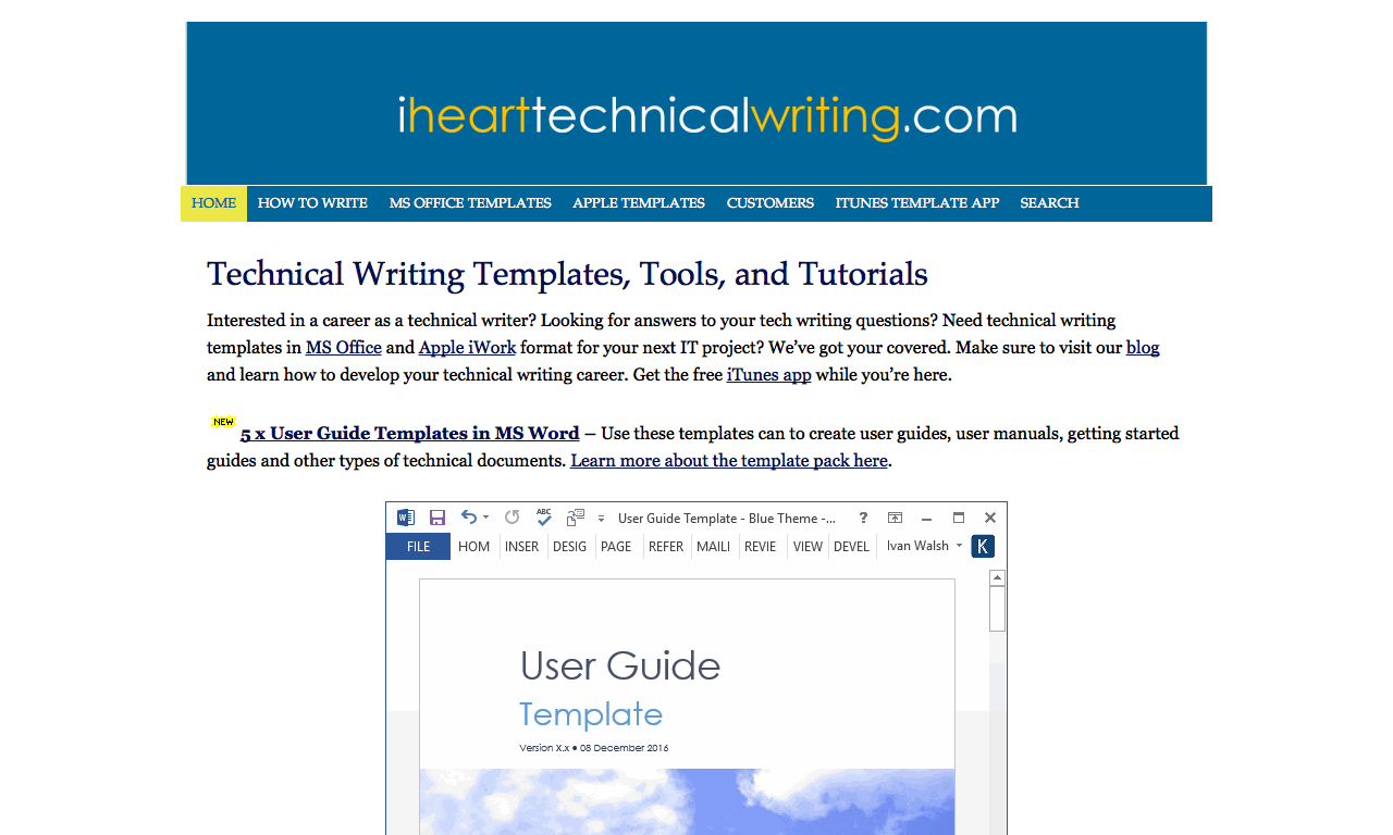 Freelance technical writer Ivan Walsh's website is a platform for useful information about technical communication, from templates to blogs and tools.